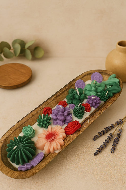 Botanical Garden Dough Bowl Candle | Handcrafted Wax Flower & Cactus Design | Long Wooden Scented Candle Centerpiece