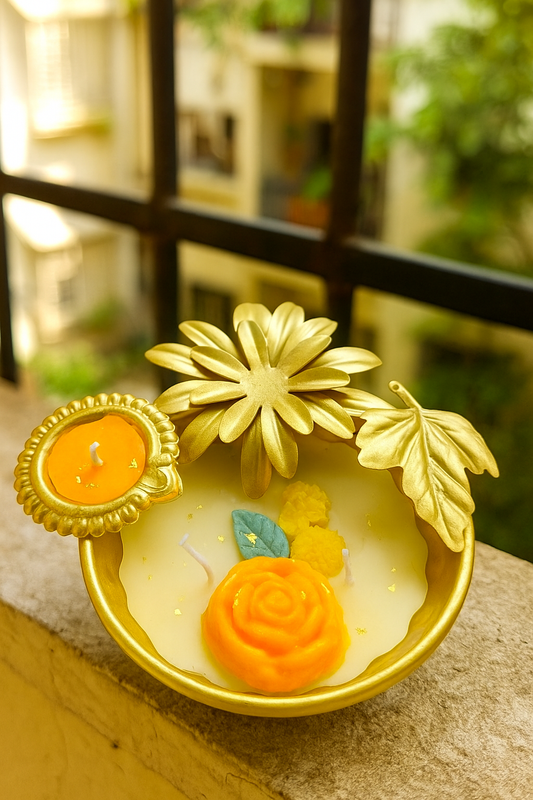 Luxury Decorative Bowl Candle with Golden Floral Design | Handcrafted Festive Rose Candle for Home Décor & Gifting